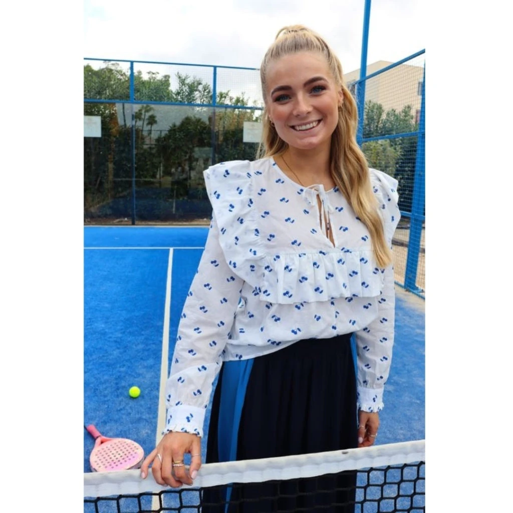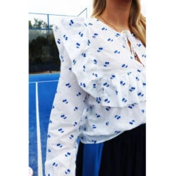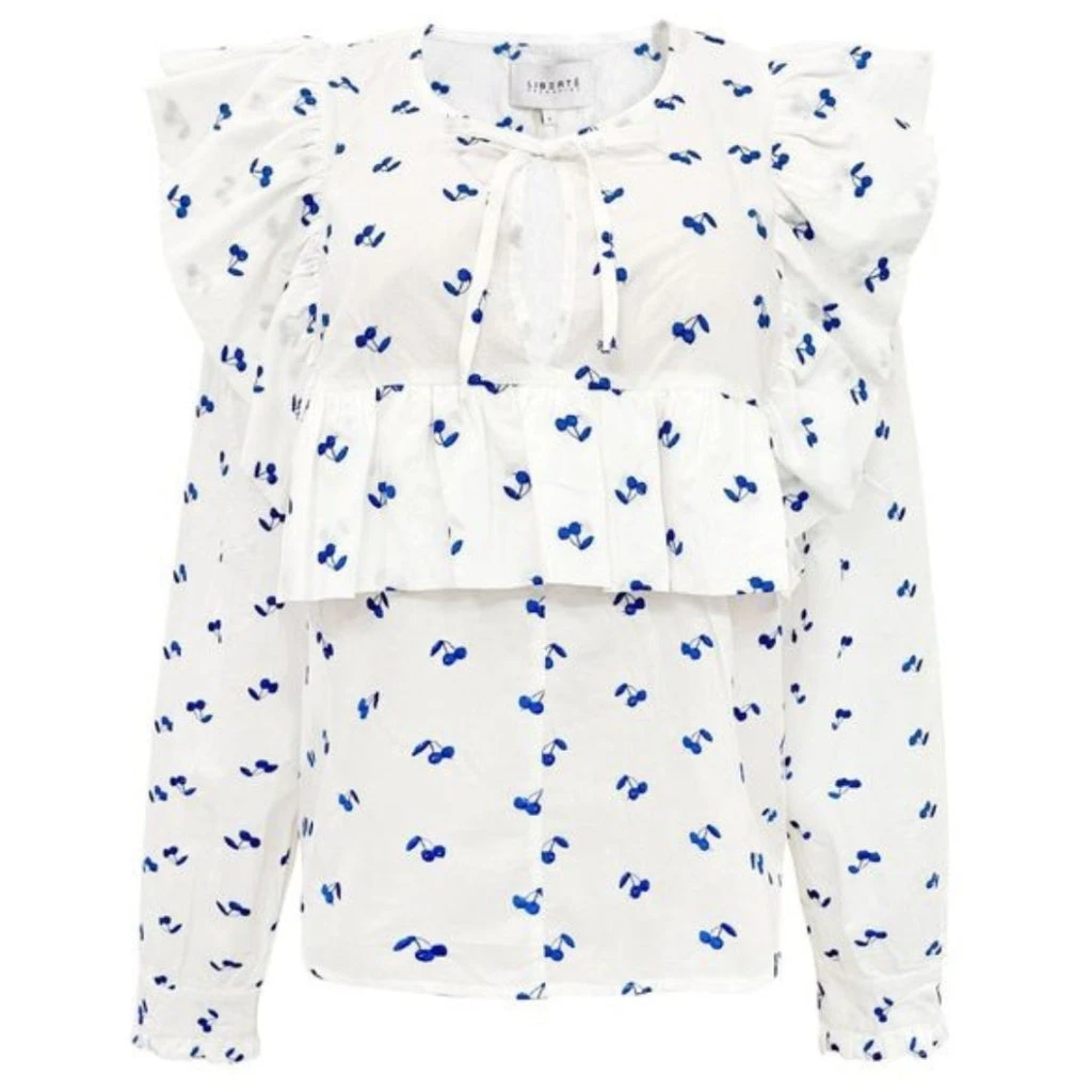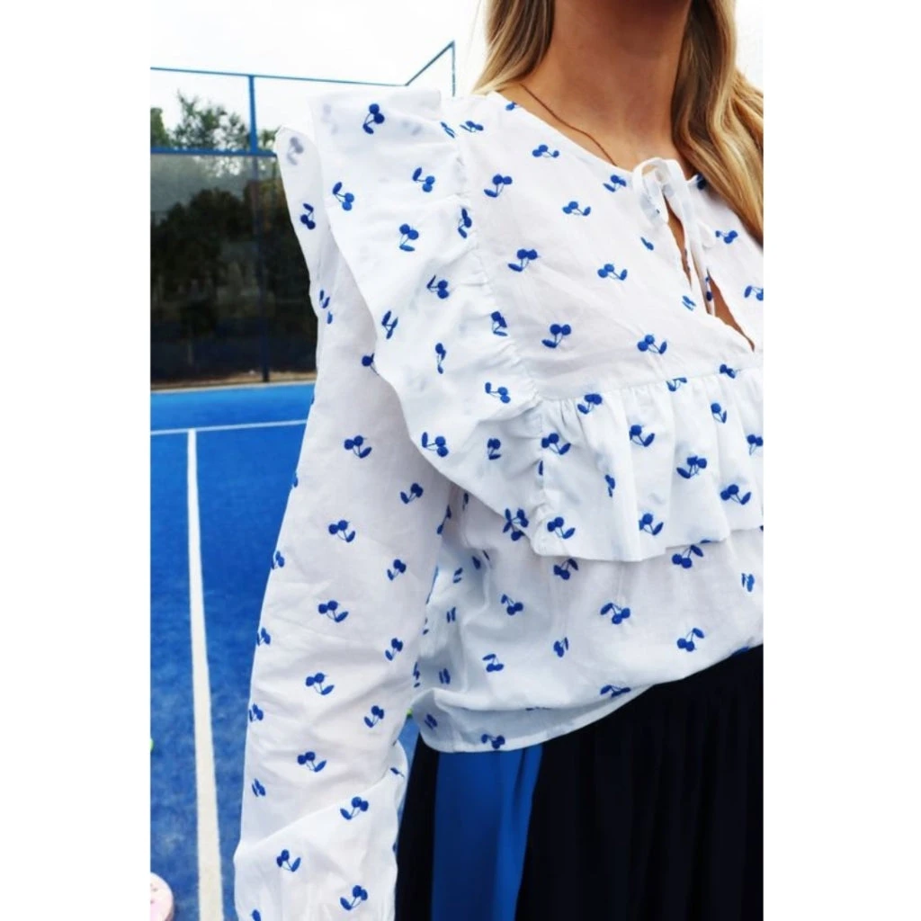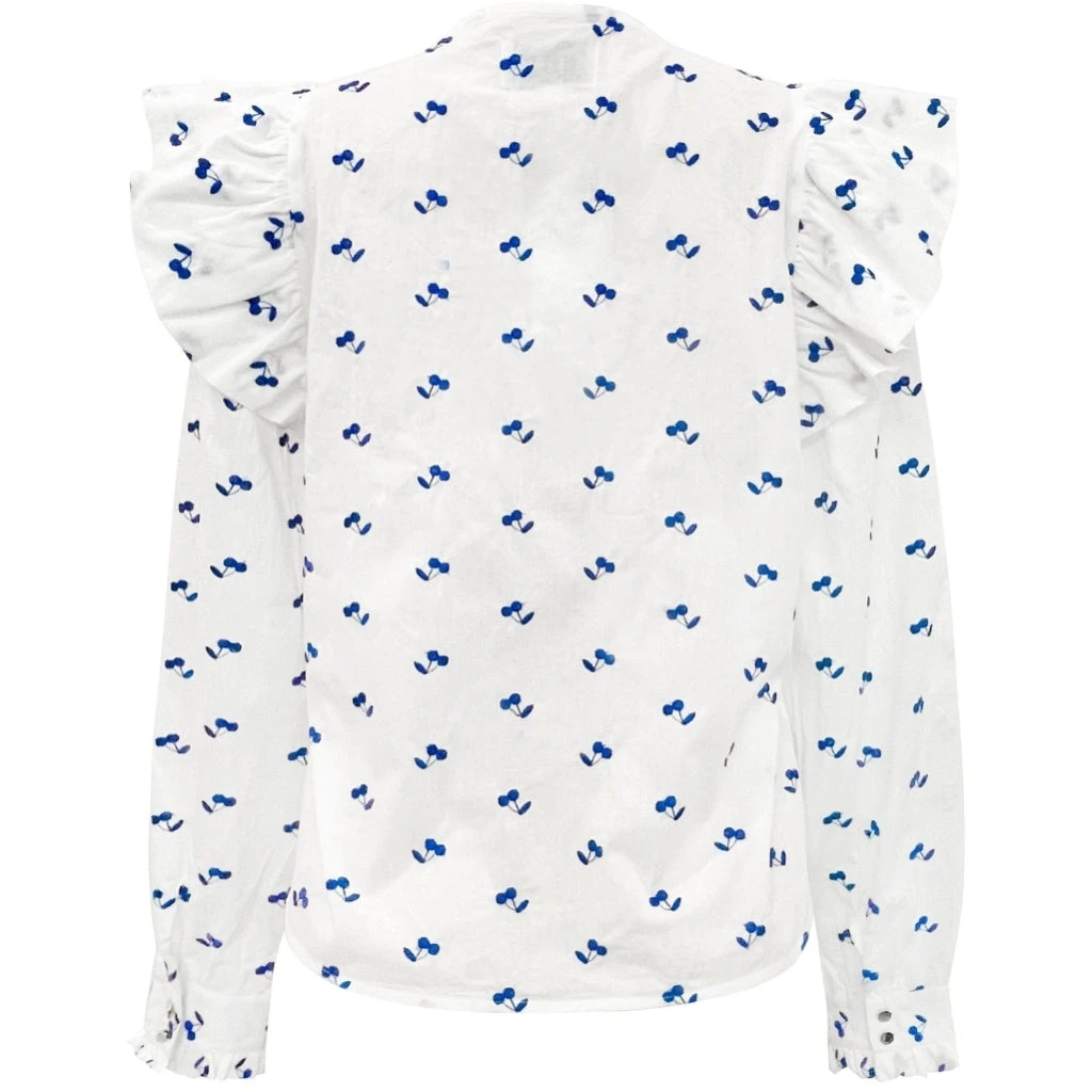 Smuk flæsebluse med blå kirsebær fra Liberté. Blusen er super feminin og elegant, og kan både bruges til habitbukser og nederdele. En uundværlig bluse i den fine garderobe.