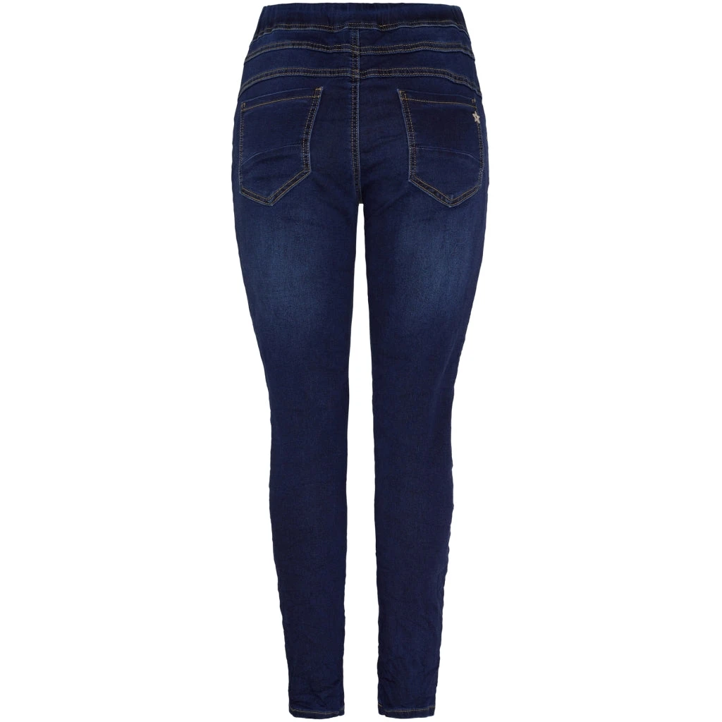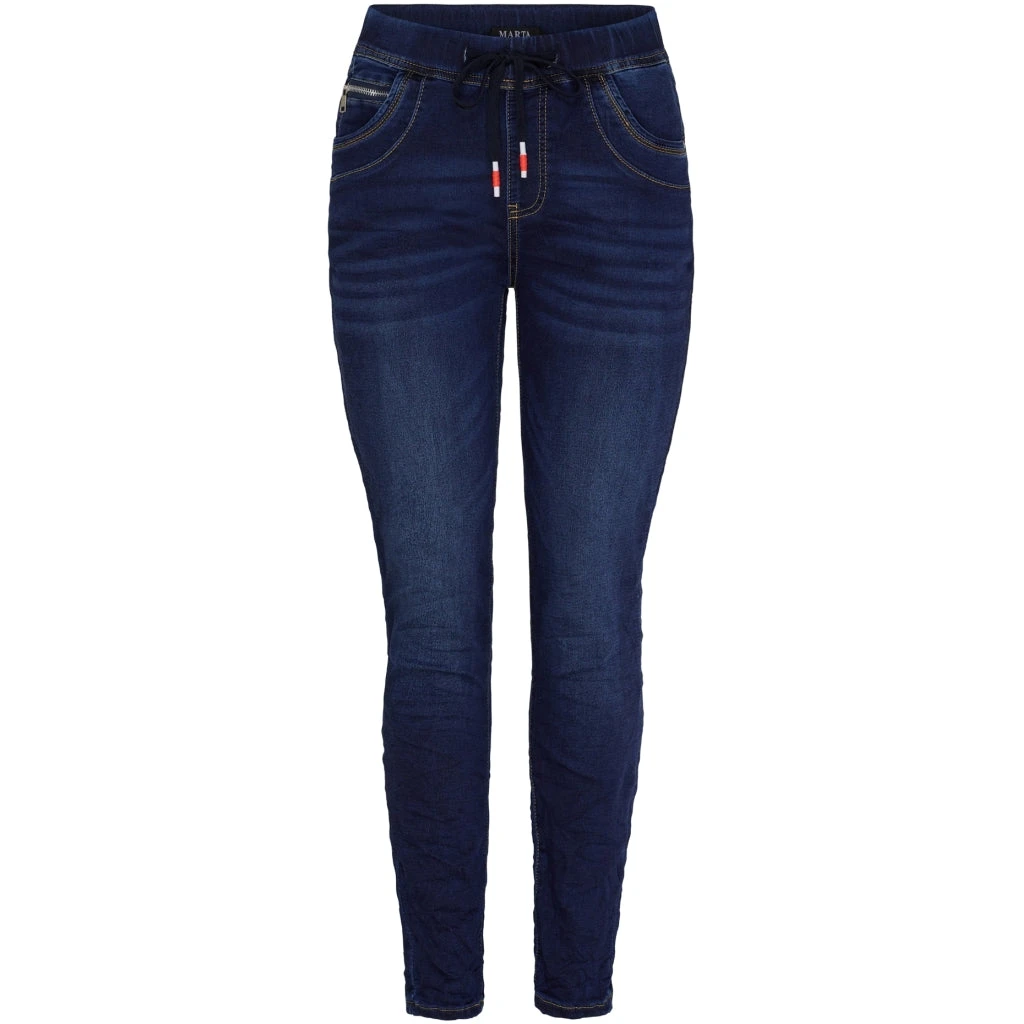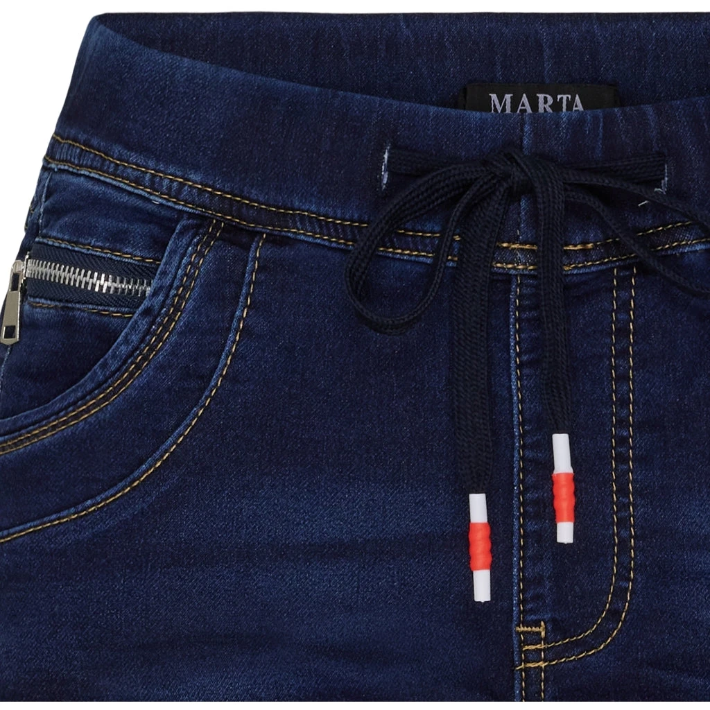 Fede tætsiddende jeans fra Marta. Jeansene har lyse syninger og lommer både foran og bagpå, og har sorte bindebånd med røde og hvide detaljer for at skabe noget kant.