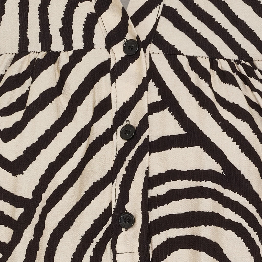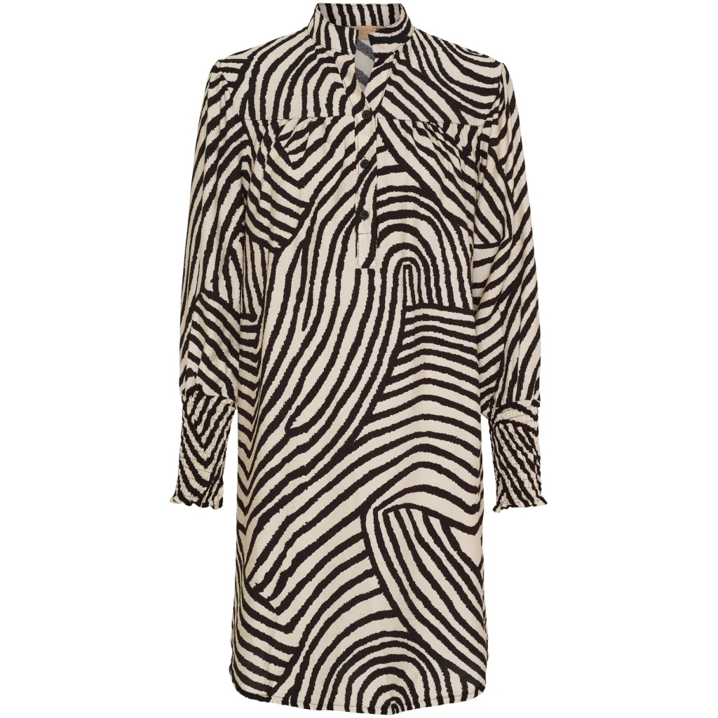 Smuk mønstret kjole med smock på ærmerne, knapper og krave. Super fin til fest med et par støvler eller stiletter, eller til hverdag med leggings og støvler – mulighederne er mange.
