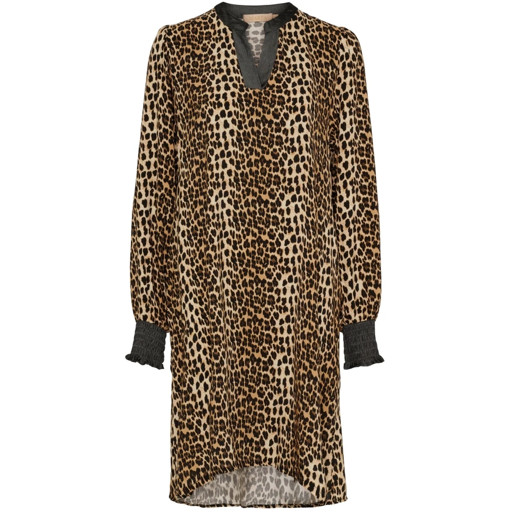 Smart leopardkjole med v-hals og smockdetaljer fra håndleddene fra Marta du Château. Kjolen er en smule længere bagtil end foran for en fed effekt.