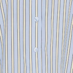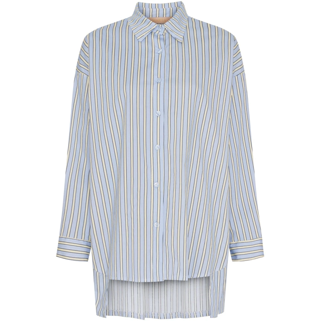 Super cool stribet skjorte der er lidt længere bagtil end foran. Skjorten er gennemknappet og har en klassisk krave. Super nem at style med både jeans og nederdele alt efter looket du går efter.