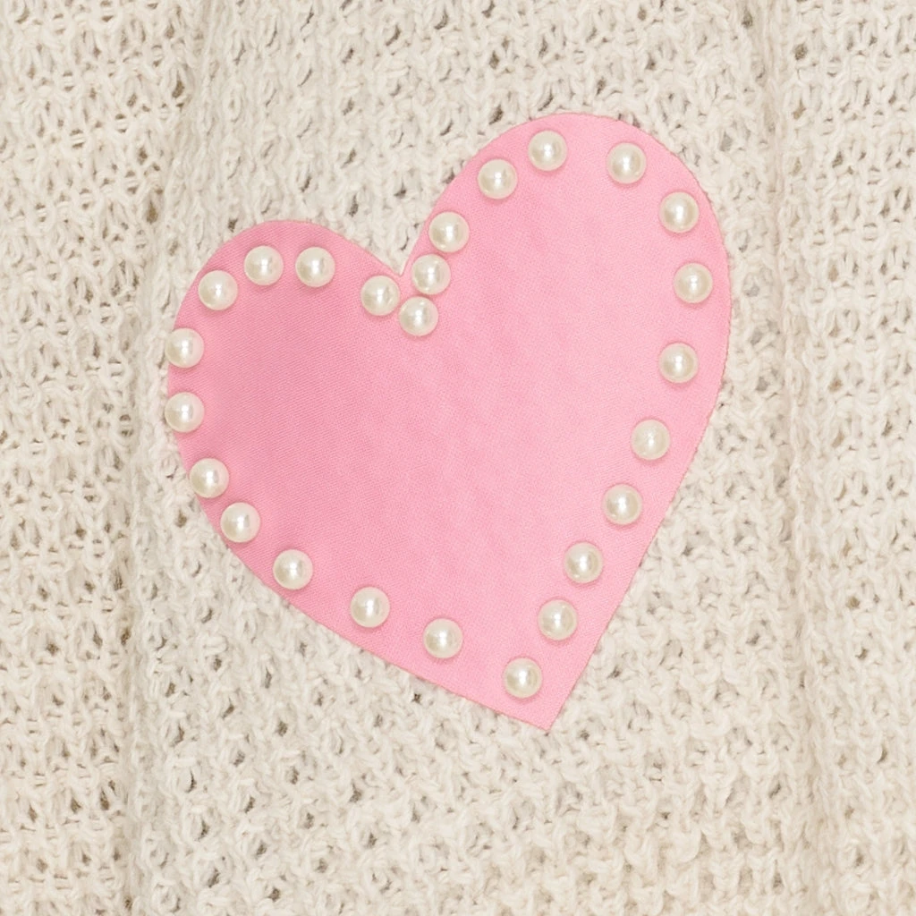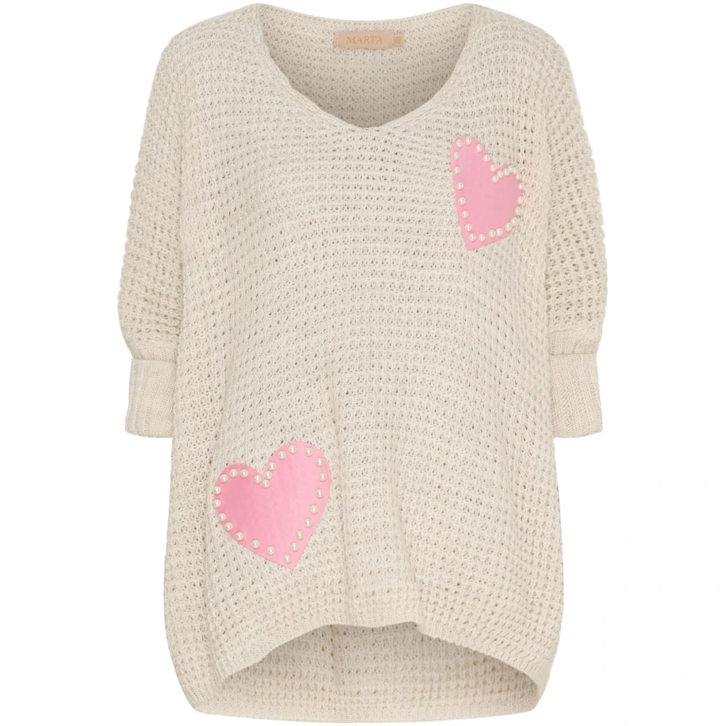 Feminin strik fra Marta Du Château. Strikken har fine hjertemotiver med små perleknapper på, og den er en smule længere bagtil end foran. Kan bruges med både leggings og jeans.