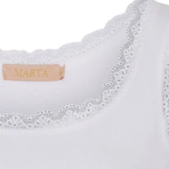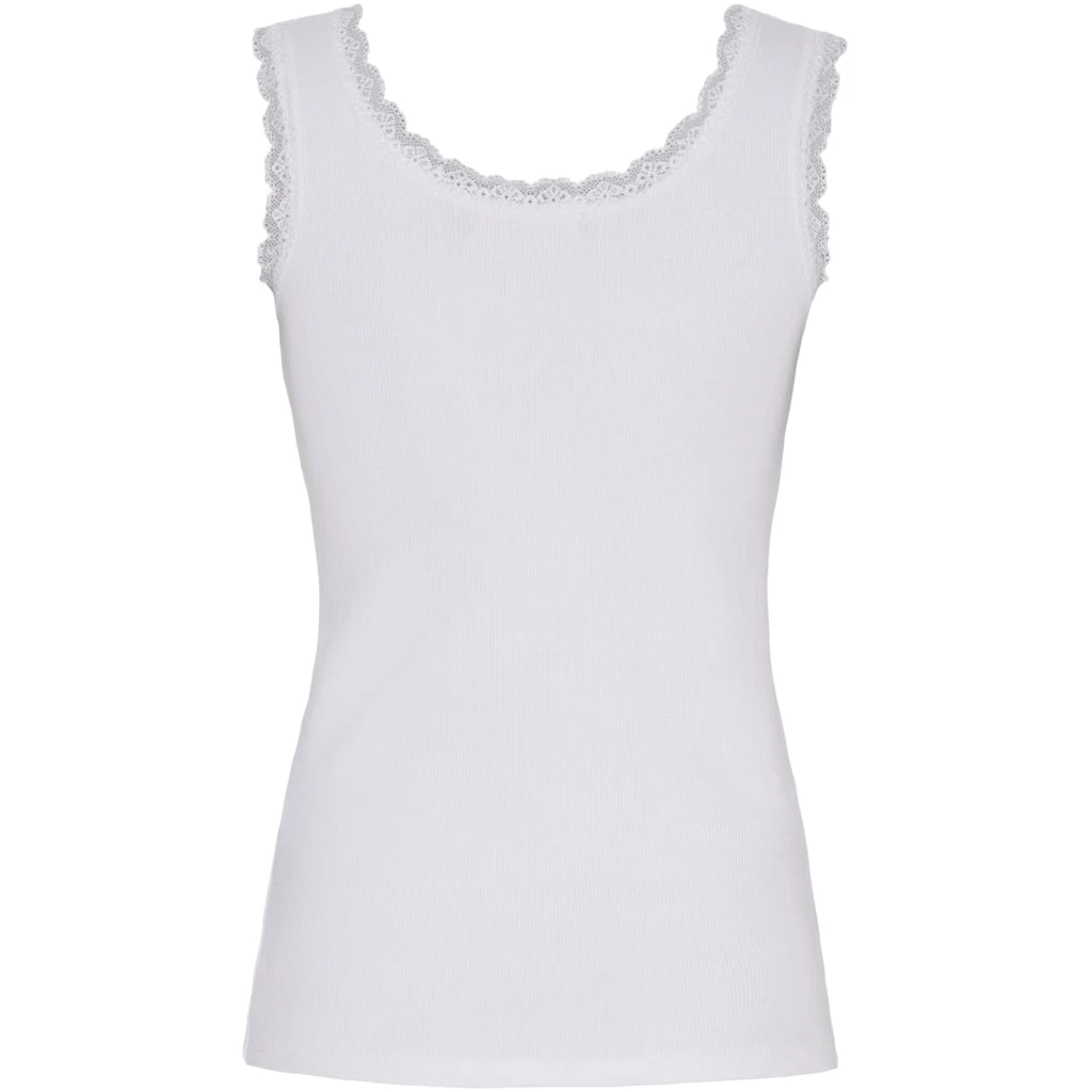 Feminin tanktop med fine blondedetaljer langs halsudskæringen og ærmegaberne. Fungerer som basislag eller til at style alene på varme dage.
