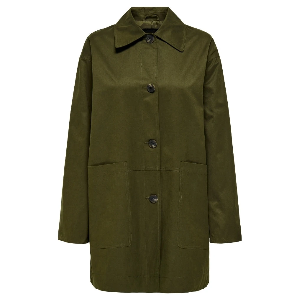 Fin frakke fra Only med krave, knaplukning og praktiske sidelommer. Frakken har en løs pasform, og den er nem at style over ethvert outfit. Kan bruges sæson efter sæson.