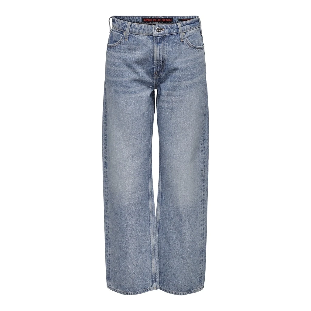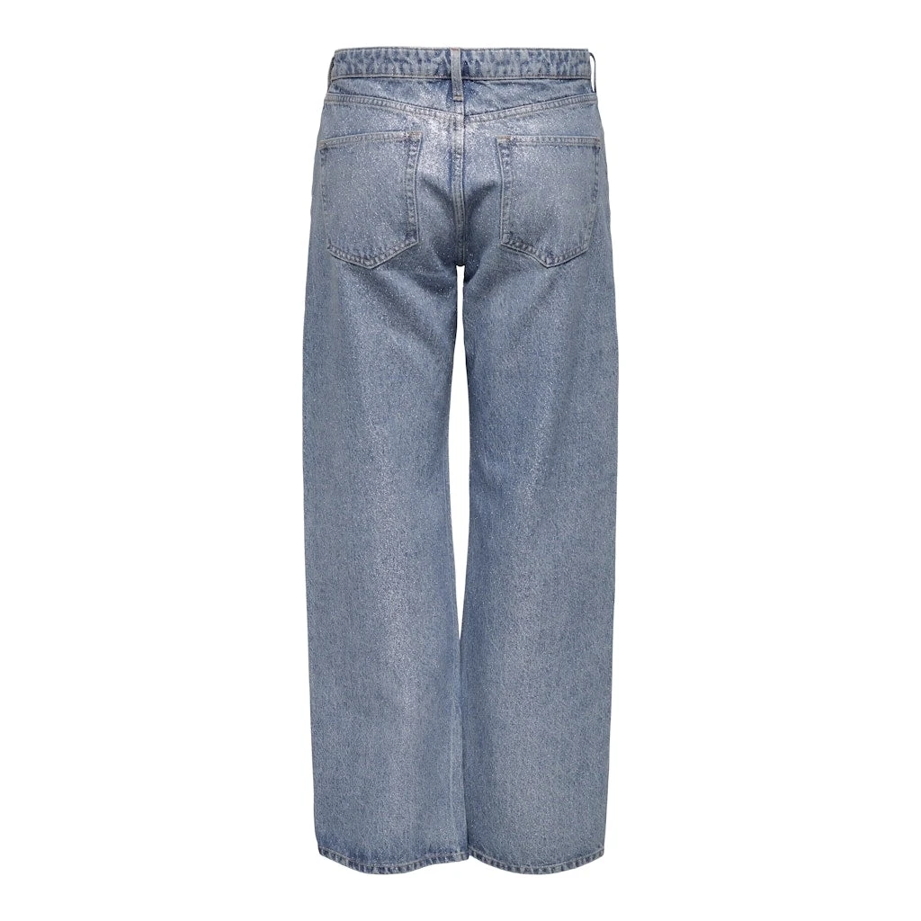 Only glimmerjeans med vide bukseben, sidelommer og baglommer. Jeansene kan styles afslappet med sneakers eller gøres festlige med stiletter.