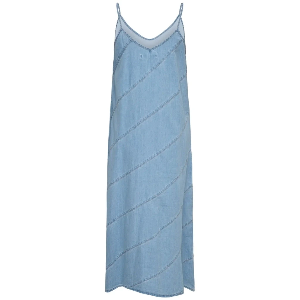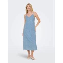 Smuk kjole fra Only i denimlook. Style til hverdagen med et par sandaler og basis cardigan. Eller style med et par stiletter og blazer til sommerens fester.