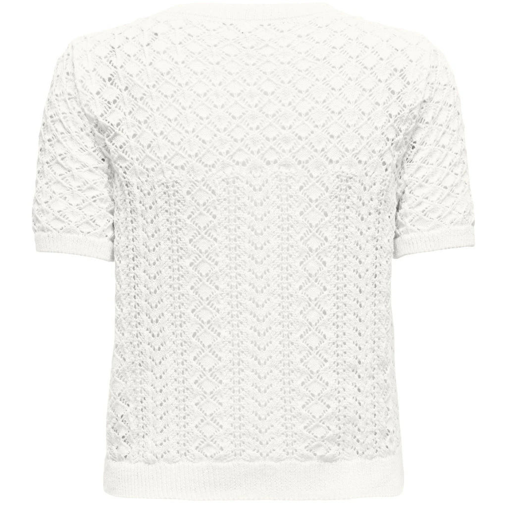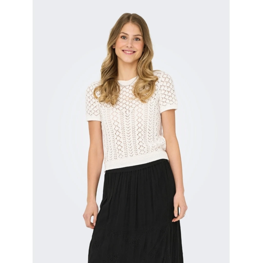 Smuk strik t-shirt fra Only med hulmønster, der gør at den et let gennemsigtig. Style den derfor evt. med en basis top under. Den er super fin og feminin, og kan både bruges til jeans og nederdele.