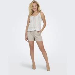 Sød top fra Only med hulmønster der gør den let gennemsigtig. Dens lette og luftige materiale gør den ideel til sommeren med et par shorts og sandaler, og det hæklede design giver den et fint, romantisk look.