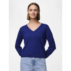 Klassisk pullover med v-hals fra Pieces. Fremstillet i et blødt og behageligt materiale, der gør den ideel til hverdagsbrug. Kan styles med et par jeans eller en nederdel alt efter anledning.
