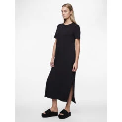 Lang smørblød t-shirt kjole fra Pieces. Kjolen har et fint lille slids i den ene side, og den kan både dresses op og ned efter anledning. For et casual hverdagslook, style den med et par sandaler eller sneakers. For et finere look, style den med et par slingsbacks og en fin taske.