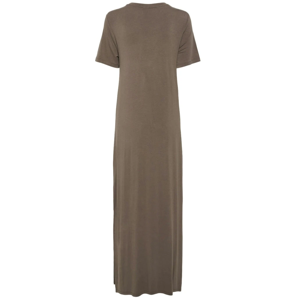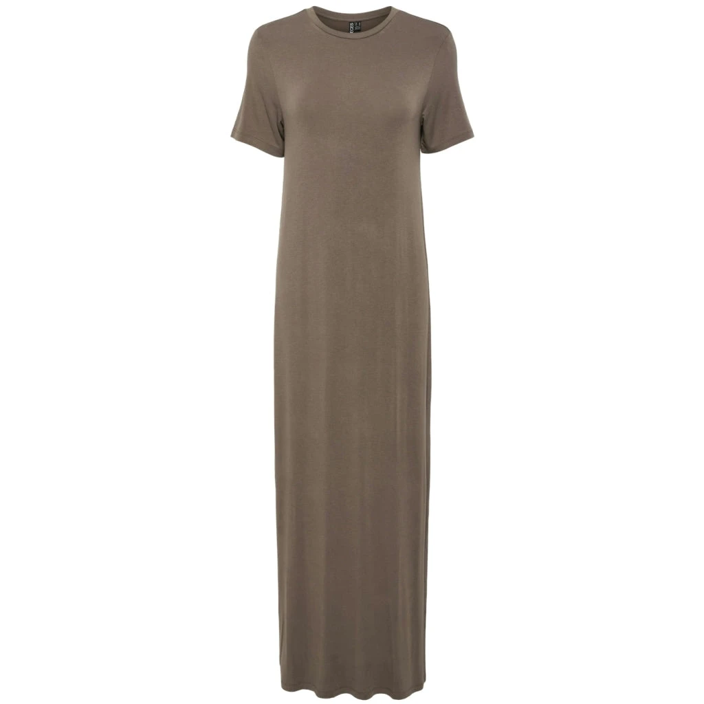 Lang smørblød t-shirt kjole fra Pieces. Kjolen har et fint lille slids i den ene side, og den kan både dresses op og ned efter anledning. For et casual hverdagslook, style den med et par sandaler eller sneakers. For et finere look, style den med et par slingsbacks og en fin taske.