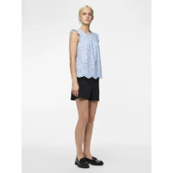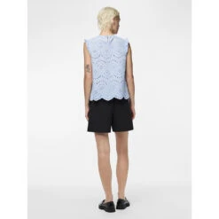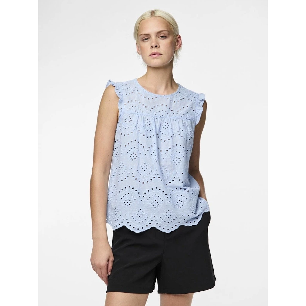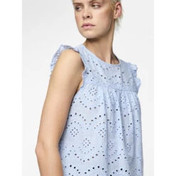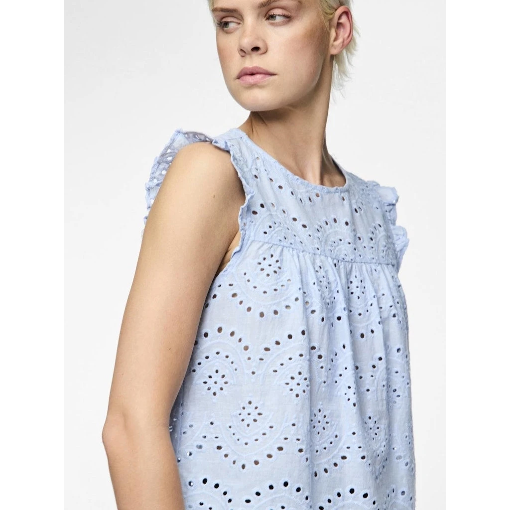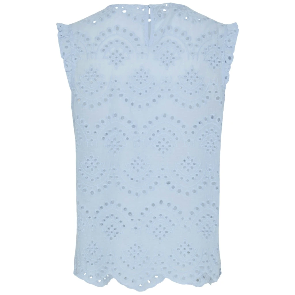 Den ultimative sommerbluse med hulmønster og fine detaljer. Kan bruges med en top under eller alene. Style den med matchende shorts for et fint, sommerligt look.