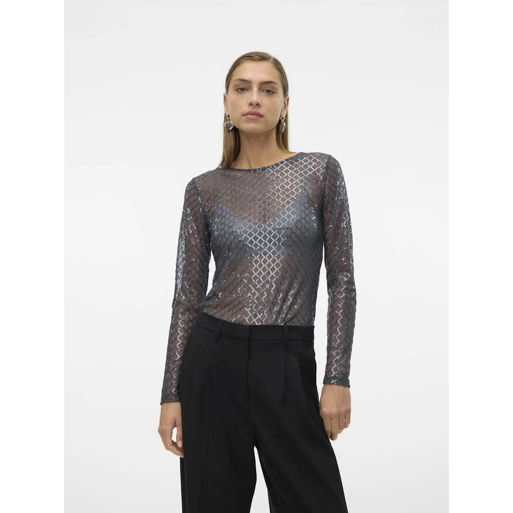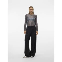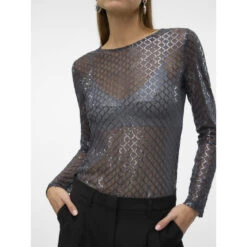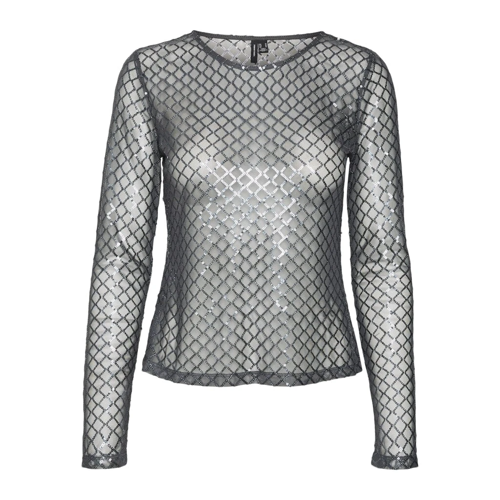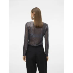 Sej, let gennemsigtig meshbluse fra Vero Moda. Blusen kan styles med matchende bukser fra samme serie for et komplet festligt look.