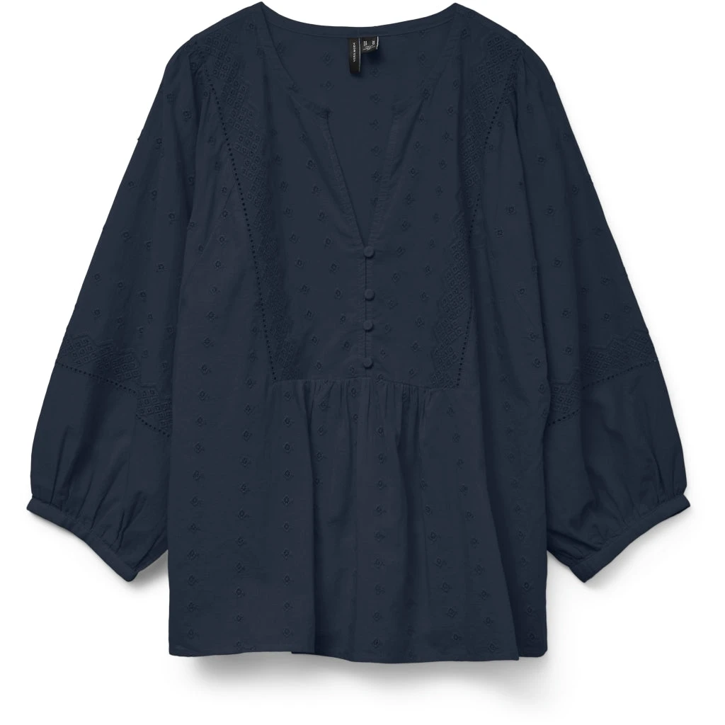 Unik, smuk bluse fra Vero Moda med de fineste detaljer og mønster. Blusen har en dyb v-udskæring, sofistikerede knapper og tunge ballonærmer. Brug den til både jeans og nederdele.